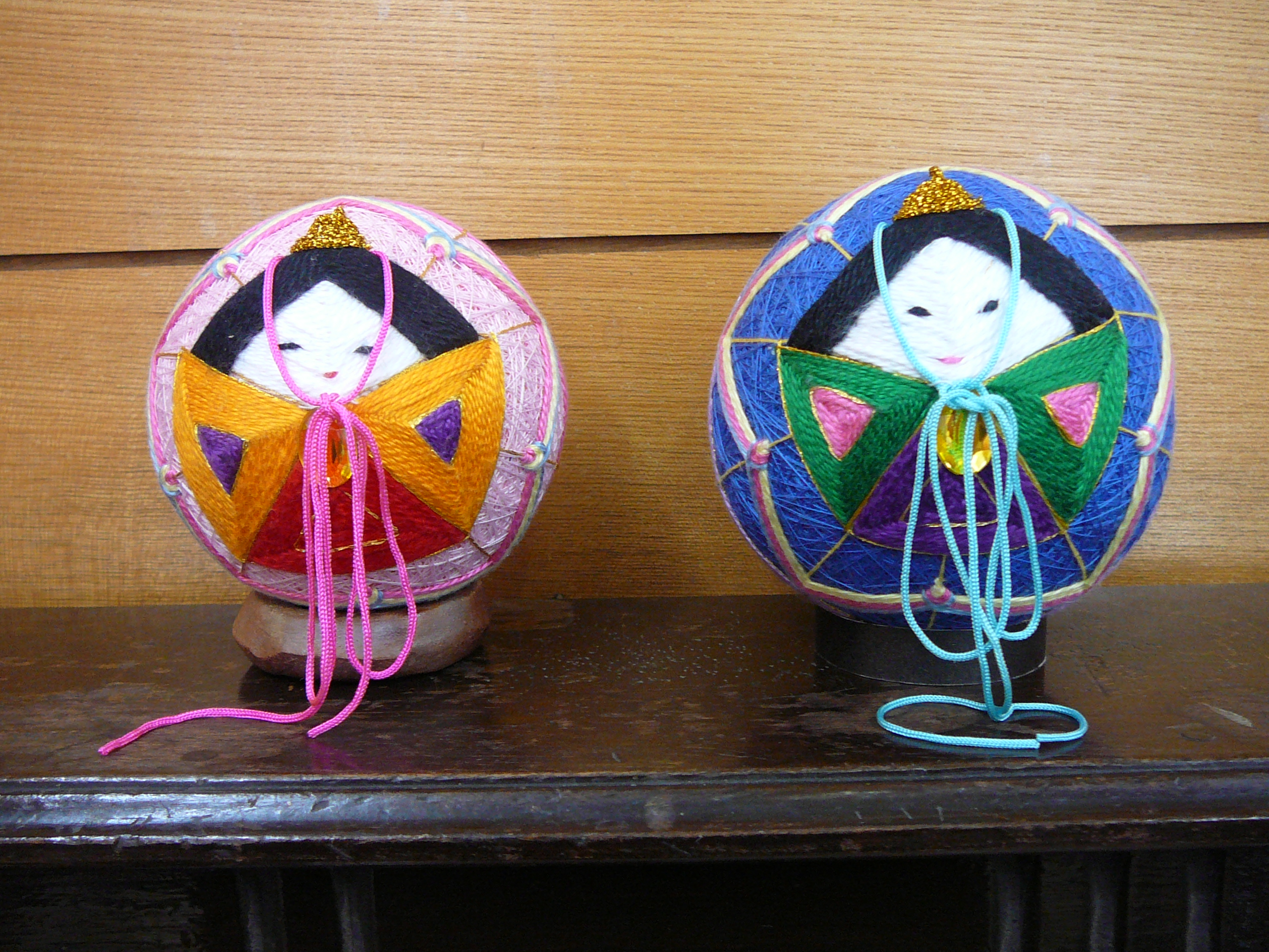 もみがらで土台を作り、太い糸で形を固定し、そのあと細い糸を巻いて、その後、刺繍糸で模様をかがって完成です。